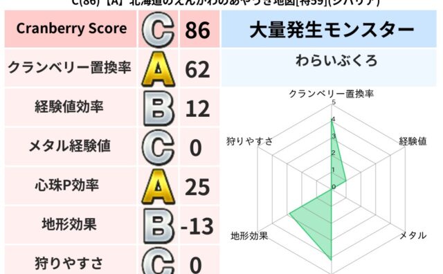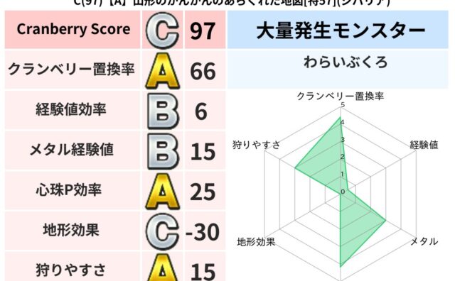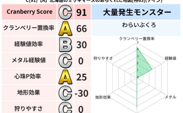 クランベリーボット判定結果の詳細クランベリースコア86クランベリー置換率66%大量発生モンスターわらいぶくろ超耐性ジバリア(77%)こころ道 完全一致モンスターしりょうのきし大神官(舞道Lv5)てつのさそりゴッドハンド(守護道Lv5)大魔道...