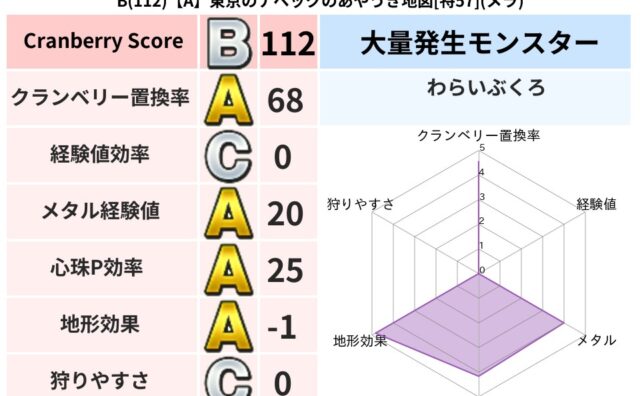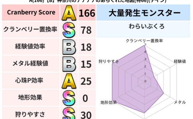 クランベリーボット判定結果の詳細クランベリースコア:170クランベリー置換率:80%大量発生モンスター:わらいぶくろギラ超耐性(0%)系統狩り(58%)こころ道 完全一致モンスターくさった死体: ゴッドハンド(守護道Lv5),大魔導士(魔力...
