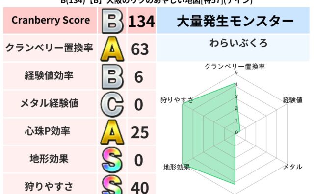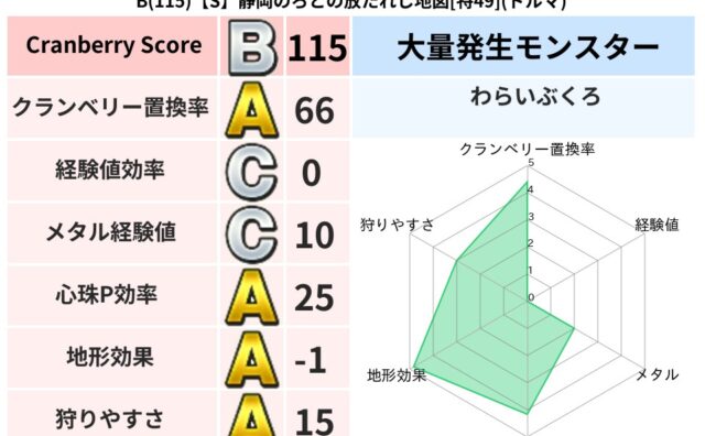 地図判定結果 B(115)【S】静岡のろとの放たれし地図[特49](ドルマ) クランベリーボット判定結果の詳細クランベリースコア:115クランベリー置換率:66%大量発生モンスター:わらいぶくろドルマ超耐性(0%)系統狩り(40%)こころ道 完全一致モンスターギズモ天地雷鳴士(共通Lv1)ばくだん岩大神官(舞道Lv5... 2024/01/02 00:33 地図判定結果