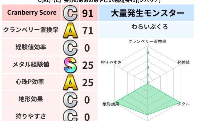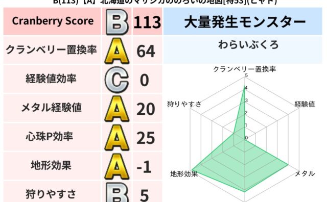 地図判定結果 B(136)【C】長野のあおのあやしい地図[特41](ジバリア) クランベリーボット判定結果の詳細クランベリースコア:136クランベリー置換率:71%大量発生モンスター:わらいぶくろジバリア超耐性(0%)こころ道 完全一致モンスターベロニャーゴ: 大魔導士(理力道Lv5)てつのさそり: ゴッドハンド(守護... 2023/12/20 17:23 地図判定結果