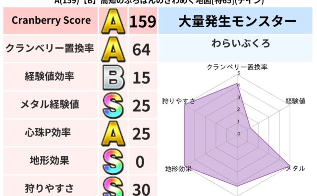 クランベリーボット判定結果の詳細クランベリースコア:162クランベリー置換率:52%大量発生モンスター:わらいぶくろイオ超耐性(8%)系統狩り(42%)こころ道 完全一致モンスターつかいま: 大魔導士(理力道Lv5)パペットマン: 天地雷鳴...