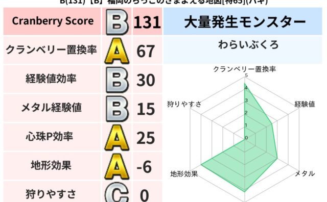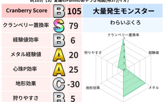 クランベリーボット判定結果の詳細クランベリースコア:184クランベリー置換率:64%大量発生モンスター:わらいぶくろデイン超耐性(0%)こころ道 完全一致モンスターどくろあらい: ゴッドハンド(守護道Lv5)かっちゅうアリ: 魔人(共通Lv...