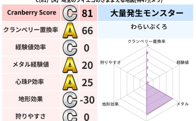 クランベリーボット判定結果の詳細クランベリースコア:129クランベリー置換率:64%大量発生モンスター:わらいぶくろバギ超耐性(0%)こころ道 完全一致モンスターがいこつ: 魔剣士(共通Lv1)シャドー: ニンジャ(波道Lv30)てつのさそ...