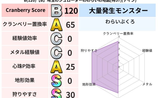 クランベリーボット判定結果の詳細クランベリースコア116クランベリー置換率67%大量発生モンスターわらいぶくろ超耐性バギ(5%)こころ道 完全一致モンスターねこまどうニンジャ(風道Lv5)デビルアーマー大神官(舞道Lv5)りゅうき兵天地雷鳴...