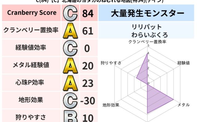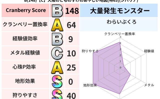 クランベリーボット判定結果の詳細クランベリースコア:96クランベリー置換率:61%大量発生モンスター:リリパット,わらいぶくろデイン超耐性(0%)こころ道 完全一致モンスターキャットフライ: ニンジャ(共通Lv1)デビルアーマー: 大神官(...
