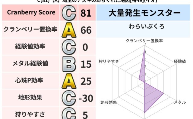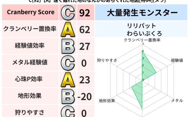 クランベリーボット判定結果の詳細クランベリースコア77クランベリー置換率62%大量発生モンスターリリパット,わらいぶくろ超耐性メラ(17%)こころ道 完全一致モンスタードロヌーバニンジャ(波道Lv5)ミニデーモン大魔道士(魔力道Lv10)デ...