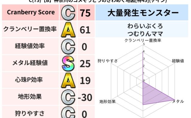 クランベリーボット判定結果の詳細クランベリースコア:92クランベリー置換率:63%大量発生モンスター:わらいぶくろドルマ超耐性(0%)こころ道 完全一致モンスターアイアンクック: 守り人(まもり道Lv5)しましまキャット: ニンジャ(共通L...