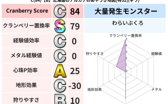 クランベリーボット判定結果の詳細クランベリースコア91クランベリー置換率71%大量発生モンスターわらいぶくろ超耐性ジバリア(46%)こころ道 完全一致モンスターベロニャーゴ大魔道士(理力道Lv5)てつのさそりゴッドハンド(守護道Lv5)大魔...