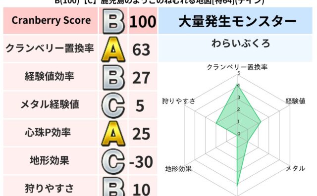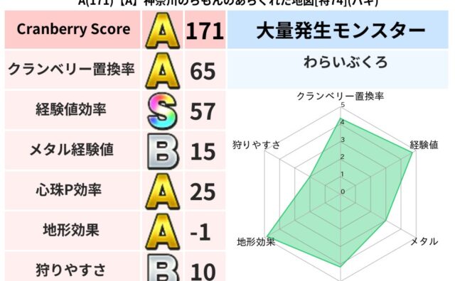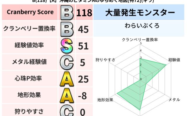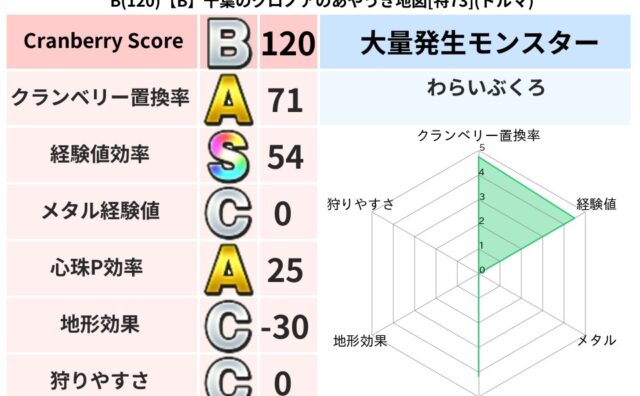 クランベリーボット判定結果の詳細クランベリースコア:100クランベリー置換率:63%大量発生モンスター:わらいぶくろデイン超耐性(39%)系統狩り(42%)こころ道 完全一致モンスターデビルアーマー大神官(舞道Lv5)おおさそりゴッドハンド...