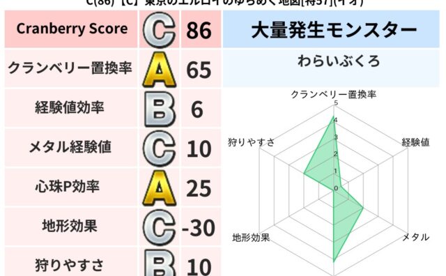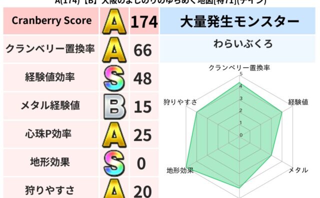 クランベリーボット判定結果の詳細クランベリースコア169クランベリー置換率66%大量発生モンスターわらいぶくろ超耐性デイン(0%)こころ道 完全一致モンスターギズモ天地雷鳴士(共通Lv1)キースドラゴン大魔道士(理力道Lv5)どろにんぎょう...