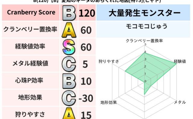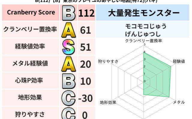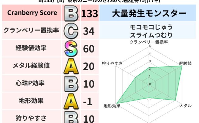 地図判定結果 B(133)【B】東京のニールのざわめく地図[特75](バギ) クランベリーボット判定結果の詳細クランベリースコア133クランベリー置換率34%大量発生モンスターモコモコじゅう,スライムつむり超耐性バギ(0%)超耐性・弱耐性なしデインドルマこころ道 完全一致モンスターみならいあくまニンジャ(風道Lv5)... 2025/10/04 05:26 地図判定結果