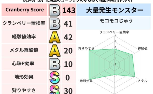 地図判定結果 B(143)【B】北海道のコーラックのゆらめく地図[特69](ドルマ) クランベリーボット判定結果の詳細クランベリースコア143クランベリー置換率41%大量発生モンスターモコモコじゅう超耐性ドルマ(0%)超耐性・弱耐性なしギラデイン系統狩りけもの系54%こころ道 完全一致モンスタースカルガルードラゴン(竜道Lv... 2025/10/06 20:10 地図判定結果