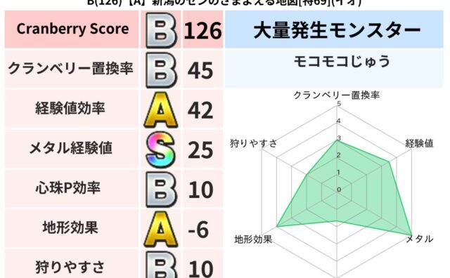 地図判定結果 B(126)【A】新潟のセンのさまよえる地図[特69](イオ) クランベリーボット判定結果の詳細クランベリースコア126クランベリー置換率45%大量発生モンスターモコモコじゅう超耐性イオ(5%)超耐性・弱耐性なしメラバギこころ道 完全一致モンスターどれいへいしドラゴン(人道Lv5)モコモコじゅうニンジャ... 2025/10/01 15:06 地図判定結果