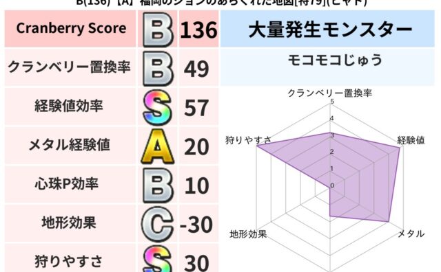 クランベリーボット判定結果の詳細クランベリースコア144クランベリー置換率40%大量発生モンスターモコモコじゅう,タップペンギー超耐性バギ(0%)超耐性・弱耐性なしデインこころ道 完全一致モンスターしのどれいゴッドハンド(守護道Lv5)大魔...
