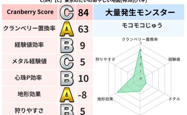 クランベリーボット判定結果の詳細クランベリースコア:133クランベリー置換率:39%大量発生モンスター:モコモコじゅう,スライムつむりギラ超耐性(6%)超耐性・弱耐性なし:イオ,ジバリアこころ道 完全一致モンスターくさった死体: ゴッドハン...
