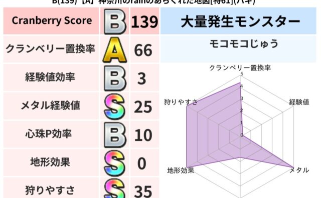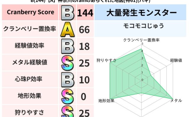クランベリーボット判定結果の詳細クランベリースコア:114クランベリー置換率:68%大量発生モンスター:モコモコじゅうジバリア超耐性(0%)系統狩り(42%)こころ道 完全一致モンスターしのどれい: ゴッドハンド(守護道Lv5),大魔導士(...