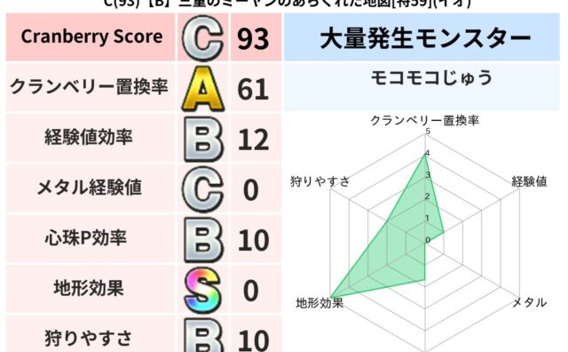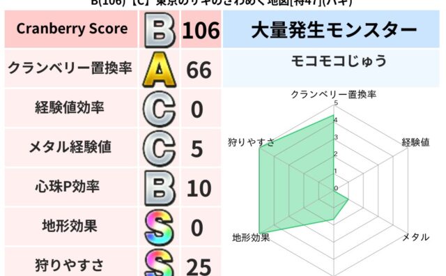 クランベリーボット判定結果の詳細クランベリースコア:151クランベリー置換率:66%大量発生モンスター:モコモコじゅうドルマ超耐性(0%)系統狩り(43%)こころ道 完全一致モンスターがいこつ: 魔剣士(共通Lv1)ベロニャーゴ: 大魔導士...