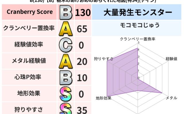 クランベリーボット判定結果の詳細クランベリースコア49クランベリー置換率64%大量発生モンスターモコモコじゅう超耐性ジバリア(41%)こころ道 完全一致モンスターパペットマン天地雷鳴士(天道Lv5)ベビーサラマンダ大神官(舞道Lv5)モコモ...