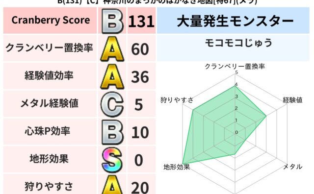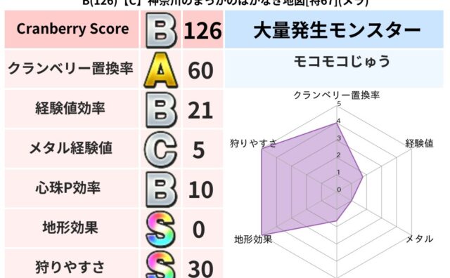 クランベリーボット判定結果の詳細クランベリースコア126クランベリー置換率60%大量発生モンスターモコモコじゅう超耐性メラ(0%)こころ道 完全一致モンスターどくイモムシニンジャ(波道Lv5)かっちゅうアリ魔人(共通Lv1)モコモコじゅうニ...