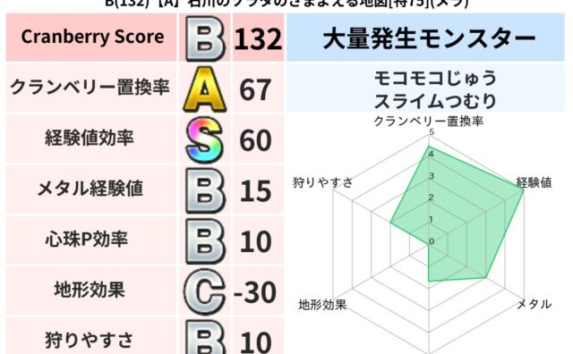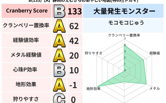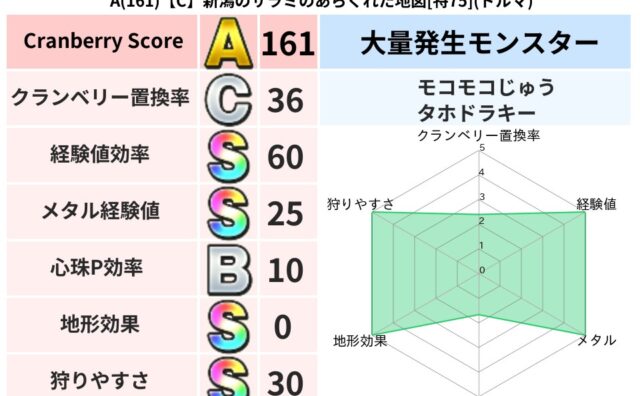 クランベリーボット判定結果の詳細クランベリースコア156クランベリー置換率36%大量発生モンスターモコモコじゅう,タホドラキー超耐性ドルマ(0%)超耐性・弱耐性なしヒャドバギこころ道 完全一致モンスターキメラ大魔道士(共通Lv1)キャットフ...