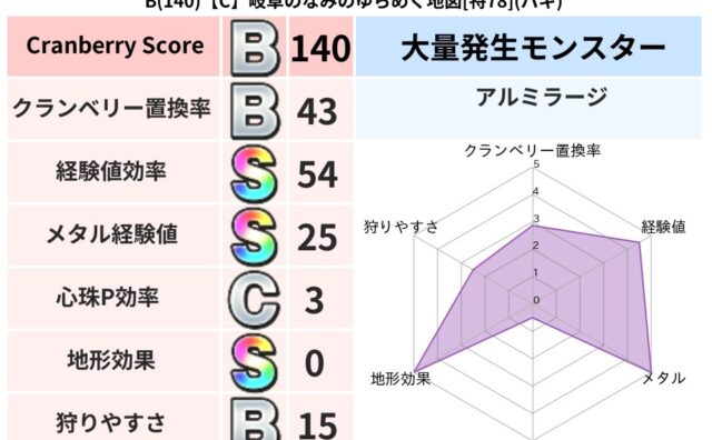 クランベリーボット判定結果の詳細クランベリースコア140クランベリー置換率43%大量発生モンスターアルミラージ超耐性バギ(0%)系統狩りけもの系56%こころ道 完全一致モンスターアルミラージドラゴン(竜道Lv5)さまようよろいゴッドハンド(...
