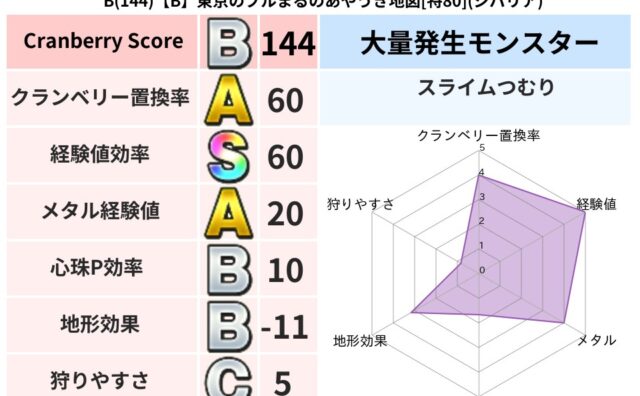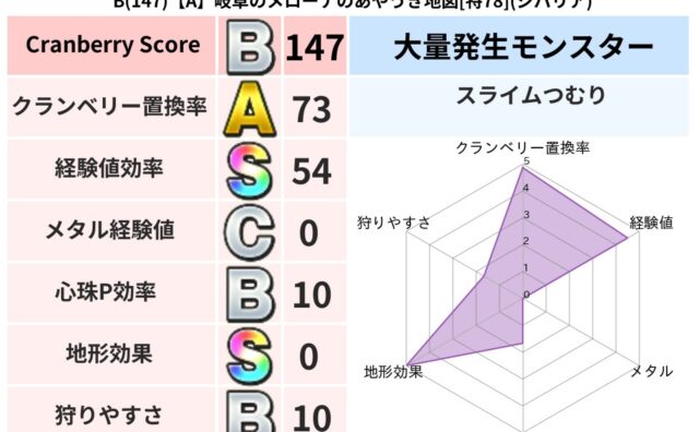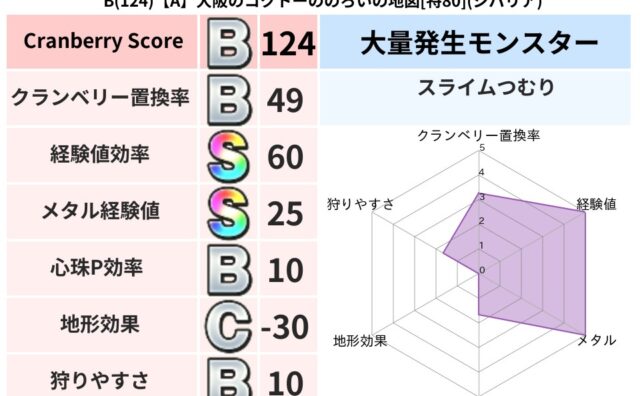 クランベリーボット判定結果の詳細クランベリースコア144クランベリー置換率60%大量発生モンスタースライムつむり超耐性ジバリア(9%)超耐性・弱耐性なしデインこころ道 完全一致モンスターギズモ天地雷鳴士(共通Lv1)キースドラゴン大魔道士(...