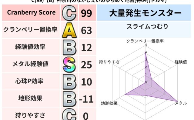 クランベリーボット判定結果の詳細クランベリースコア:114クランベリー置換率:63%大量発生モンスター:スライムつむりドルマ超耐性(9%)こころ道 完全一致モンスターしのどれいゴッドハンド(守護道Lv5),大魔導士(魔力道Lv5)おおさそり...