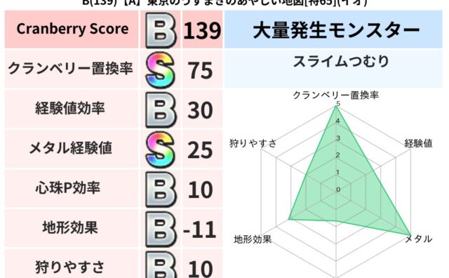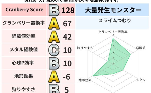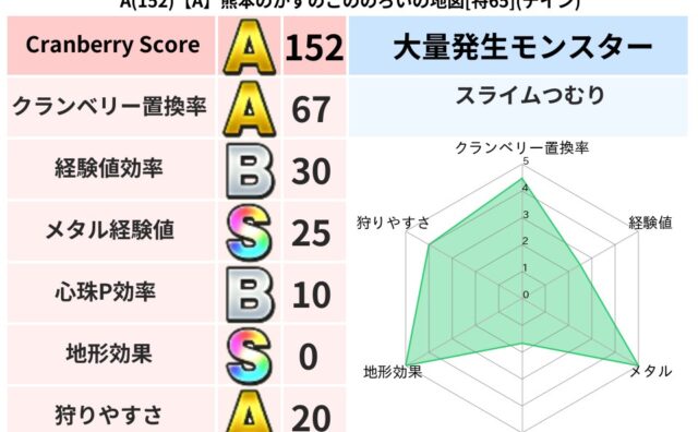 クランベリーボット判定結果の詳細クランベリースコア:145クランベリー置換率:66%大量発生モンスター:スライムつむりメラ超耐性(14%)こころ道 完全一致モンスターがいこつ: 魔剣士(共通Lv1)しりょうのきし: 大神官(舞道Lv5)かっ...
