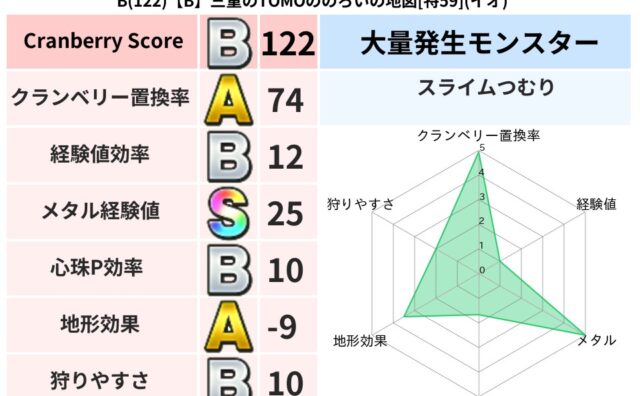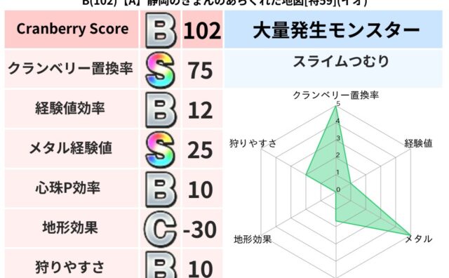クランベリーボット判定結果の詳細クランベリースコア124クランベリー置換率75%大量発生モンスタースライムつむり超耐性イオ(9%)こころ道 完全一致モンスターデビルアーマー大神官(舞道Lv5)しりょうのきし大神官(舞道Lv5)キースドラゴン...