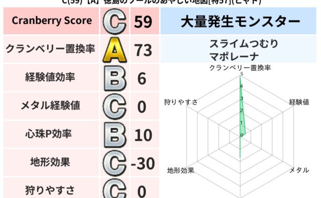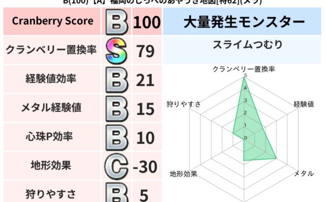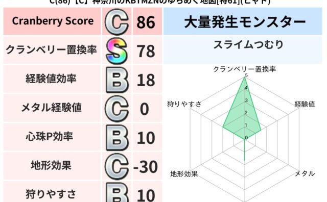 クランベリーボット判定結果の詳細クランベリースコア60クランベリー置換率65%大量発生モンスタースライムつむり超耐性ドルマ(52%)こころ道 完全一致モンスターヒートギズモ守り人(ささえ道Lv5)ベビーサラマンダ大神官(舞道Lv5)おおさそ...