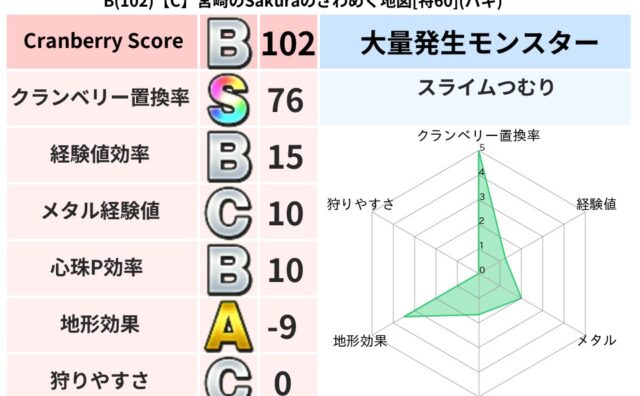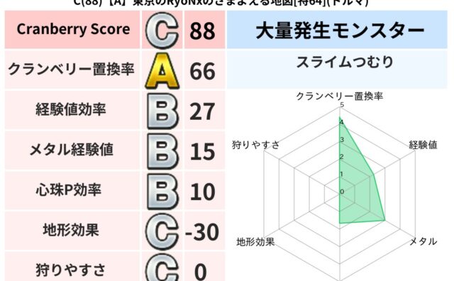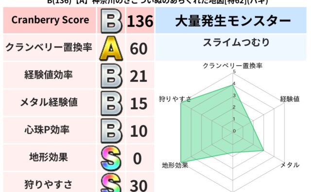 クランベリーボット判定結果の詳細クランベリースコア:88クランベリー置換率:66%大量発生モンスター:スライムつむりドルマ超耐性(50%)こころ道 完全一致モンスターどくどくゾンビ魔剣士(共通Lv1)ストーンマンゴッドハンド(守護道Lv5)...