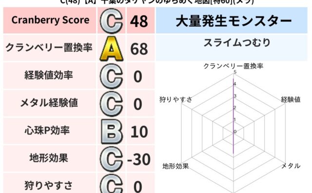 クランベリーボット判定結果の詳細クランベリースコア:63クランベリー置換率:68%大量発生モンスター:スライムつむりメラ超耐性(52%)こころ道 完全一致モンスターキャットフライニンジャ(共通Lv1)ヒートギズモ守り人(ささえ道Lv5)かっ...