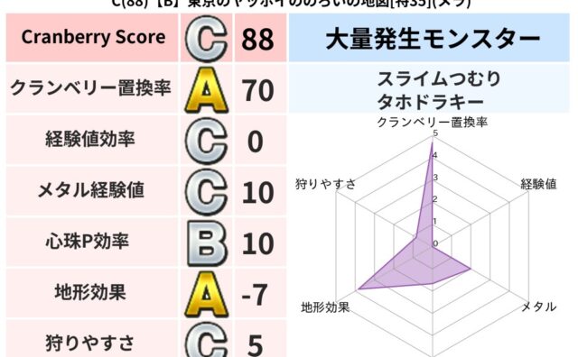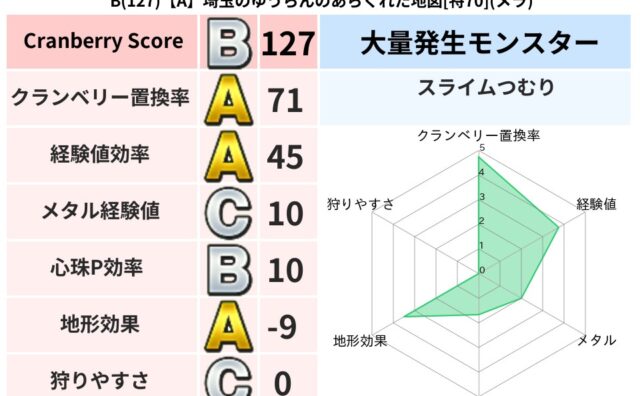 クランベリーボット判定結果の詳細クランベリースコア138クランベリー置換率44%大量発生モンスタースライムつむり超耐性ジバリア(5%)超耐性・弱耐性なしバギこころ道 完全一致モンスターリカントマムルドラゴン(竜道Lv5)スマイルロック守り人...
