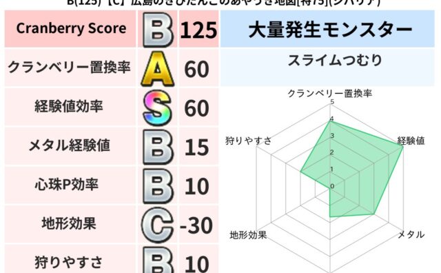 クランベリーボット判定結果の詳細クランベリースコア112クランベリー置換率71%大量発生モンスタースライムつむり超耐性メラ(7%)こころ道 完全一致モンスターどくろあらいゴッドハンド(守護道Lv5)かっちゅうアリ魔人(共通Lv1)パペットマ...