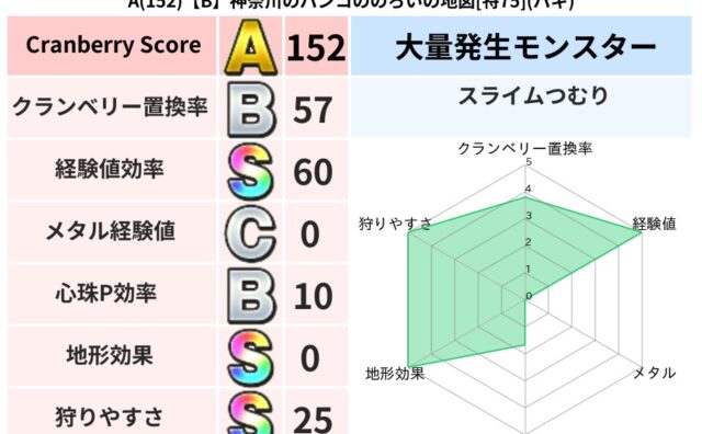 クランベリーボット判定結果の詳細クランベリースコア:138クランベリー置換率:53%大量発生モンスター:スライムつむりイオ超耐性(5%)超耐性・弱耐性なし:バギ,デインこころ道 完全一致モンスターギズモ: 天地雷鳴士(共通Lv1)ヒートギズ...