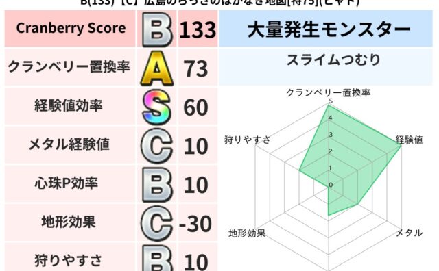クランベリーボット判定結果の詳細クランベリースコア118クランベリー置換率73%大量発生モンスタースライムつむり超耐性ヒャド(53%)超耐性・弱耐性なしデインドルマこころ道 完全一致モンスターさまようよろいゴッドハンド(守護道Lv5)かっち...
