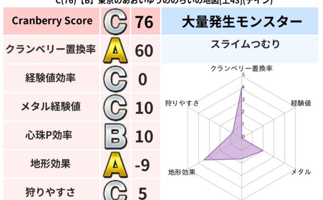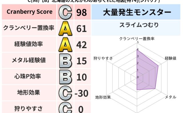 クランベリーボット判定結果の詳細クランベリースコア:138クランベリー置換率:53%大量発生モンスター:スライムつむりイオ超耐性(5%)超耐性・弱耐性なし:バギ,デインこころ道 完全一致モンスターギズモ: 天地雷鳴士(共通Lv1)ヒートギズ...