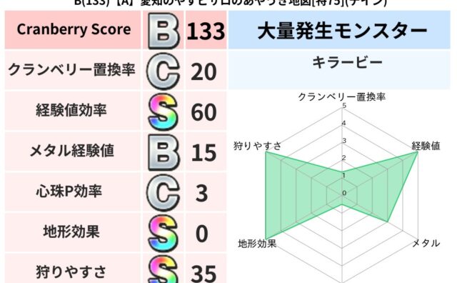 クランベリーボット判定結果の詳細クランベリースコア132クランベリー置換率37%大量発生モンスターキラービー超耐性デイン(1%)超耐性・弱耐性なしバギ系統狩り虫系51%こころ道 完全一致モンスターてつのさそりゴッドハンド(守護道Lv5)大魔...