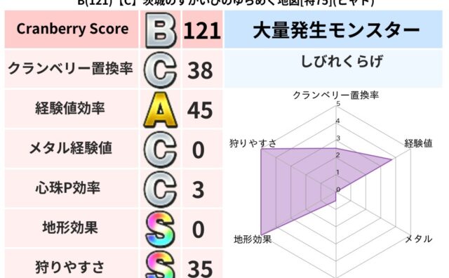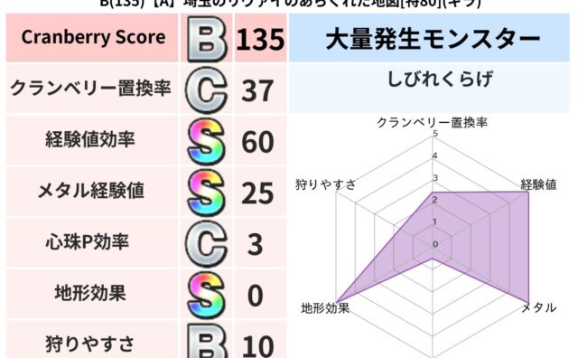 クランベリーボット判定結果の詳細クランベリースコア148クランベリー置換率48%大量発生モンスターしびれくらげ超耐性バギ(0%)超耐性・弱耐性なしドルマこころ道 完全一致モンスターしびれくらげゴッドハンド(守護道Lv5)大魔道士(魔力道Lv...