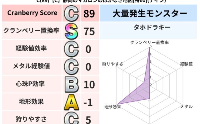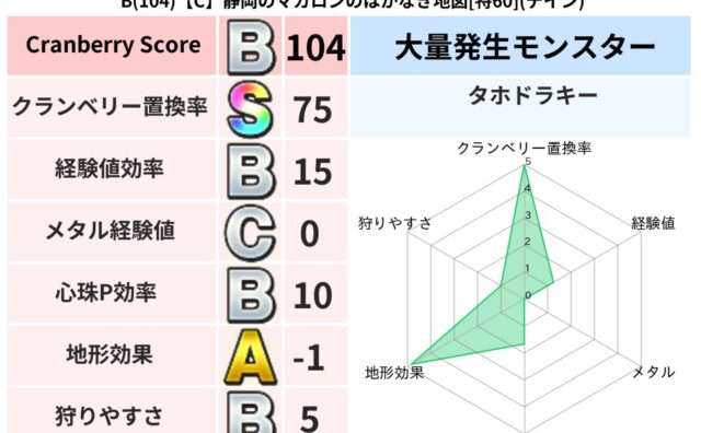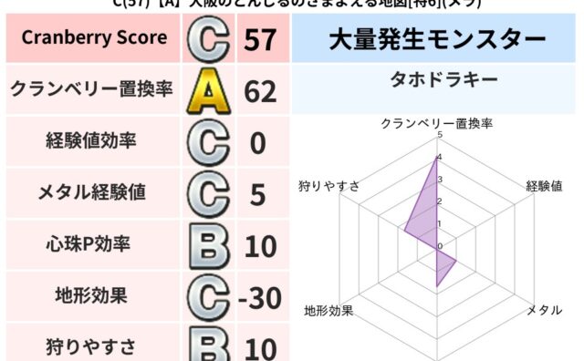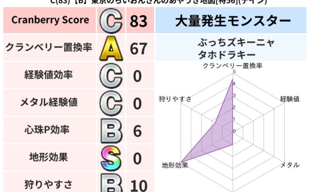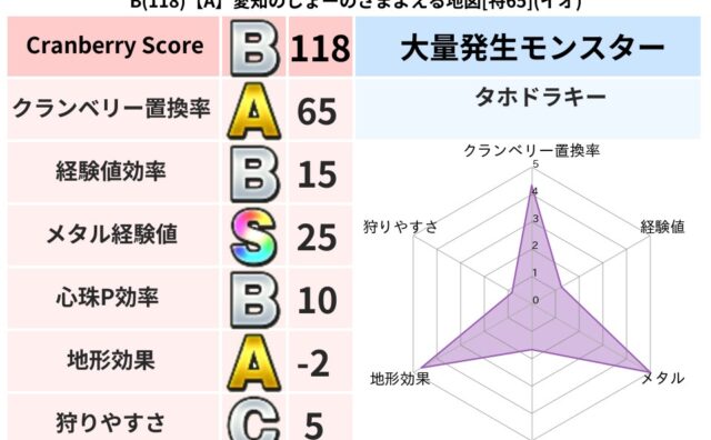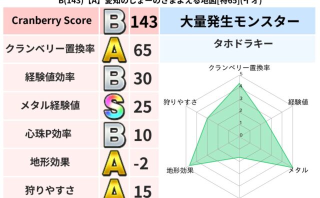 クランベリーボット判定結果の詳細クランベリースコア57クランベリー置換率62%大量発生モンスタータホドラキー超耐性メラ(73%)こころ道 完全一致モンスターブラウニー守り人(共通Lv1)フレイム守り人(ささえ道Lv5)ストーンマンゴッドハン...