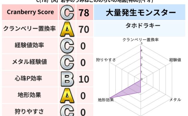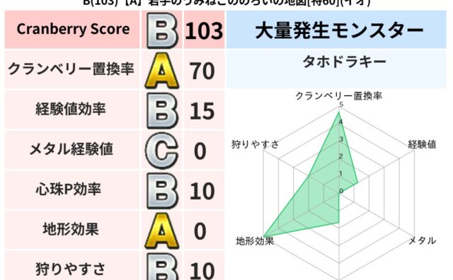 クランベリーボット判定結果の詳細クランベリースコア71クランベリー置換率61%大量発生モンスタータホドラキー超耐性ヒャド(46%)系統狩り鳥系42%こころ道 完全一致モンスターどくろあらいゴッドハンド(守護道Lv5)かっちゅうアリ魔人(共通...
