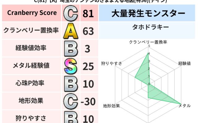 クランベリーボット判定結果の詳細クランベリースコア:105クランベリー置換率:63%大量発生モンスター:タホドラキーデイン超耐性(0%)こころ道 完全一致モンスターフロストギズモ: 魔剣士(魔道Lv5)どくどくゾンビ: 魔剣士(共通Lv1)...