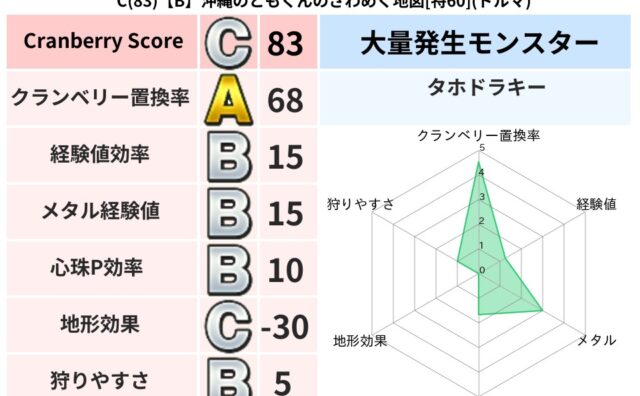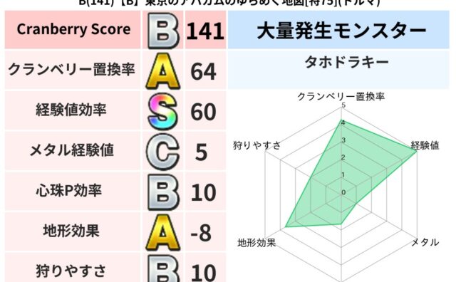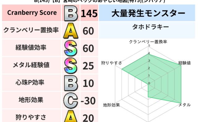 クランベリーボット判定結果の詳細クランベリースコア:121クランベリー置換率:45%大量発生モンスター:タホドラキーバギ超耐性(0%)こころ道 完全一致モンスターしのどれい: ゴッドハンド(守護道Lv5),大魔導士(魔力道Lv5)ばくだん岩...