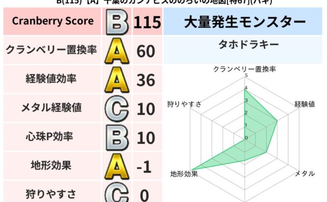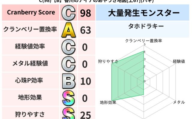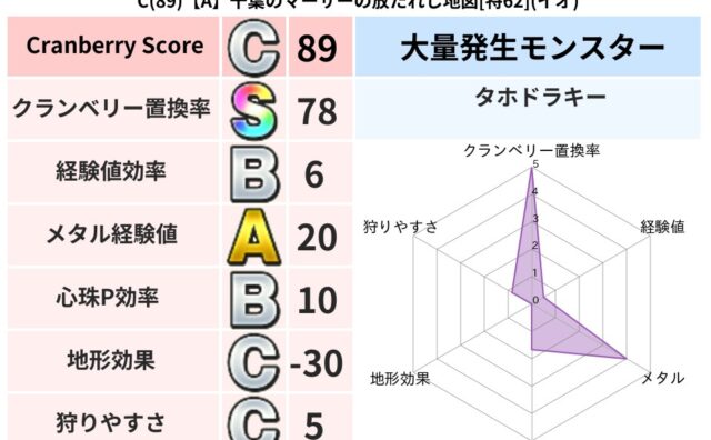 クランベリーボット判定結果の詳細クランベリースコア89クランベリー置換率78%大量発生モンスタータホドラキー超耐性イオ(42%)超耐性・弱耐性なしドルマ系統狩り鳥系48%こころ道 完全一致モンスターストーンマンゴッドハンド(守護道Lv5)タ...