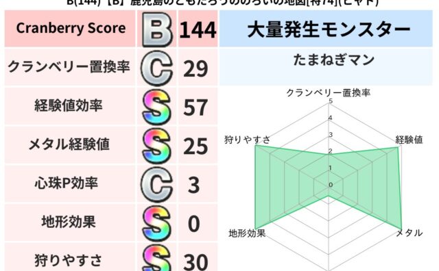 クランベリーボット判定結果の詳細クランベリースコア140クランベリー置換率40%大量発生モンスターたまねぎマン超耐性メラ(0%)超耐性・弱耐性なしギライオバギデインジバリアこころ道 完全一致モンスターたまねぎマン魔剣士(刃道Lv5)どれいへ...