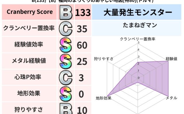 クランベリーボット判定結果の詳細クランベリースコア133クランベリー置換率35%大量発生モンスターたまねぎマン超耐性ドルマ(0%)こころ道 完全一致モンスターたまねぎマン魔剣士(刃道Lv5)ストーンマンゴッドハンド(守護道Lv5)つかいま大...