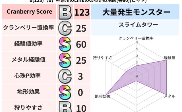 クランベリーボット判定結果の詳細クランベリースコア144クランベリー置換率19%大量発生モンスタースライムタワー超耐性デイン(0%)超耐性・弱耐性なしイオバギ系統狩りゾンビ系42%こころ道 完全一致モンスターどくどくゾンビ魔剣士(共通Lv1...