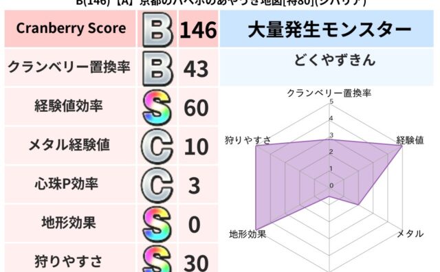 クランベリーボット判定結果の詳細クランベリースコア146クランベリー置換率43%大量発生モンスターどくやずきん超耐性ジバリア(0%)こころ道 完全一致モンスターデビルアーマー大神官(舞道Lv5)ぐんたいガニ守り人(ささえ道Lv10)さまよう...