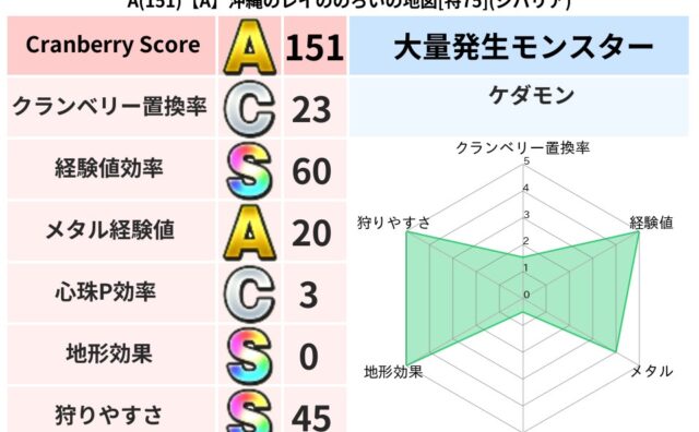 スコアA A(151)【A】沖縄のレイののろいの地図[特75](ジバリア) クランベリーボット判定結果の詳細クランベリースコア151クランベリー置換率23%大量発生モンスターケダモン超耐性ジバリア(0%)超耐性・弱耐性なしドルマ系統狩りけもの系66%こころ道 完全一致モンスターねこまどうニンジャ(風道Lv5)ケダモ... 2025/08/15 19:07 スコアA地図判定結果