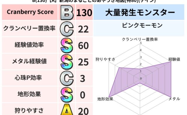 クランベリーボット判定結果の詳細クランベリースコア130クランベリー置換率22%大量発生モンスターピンクモーモン超耐性デイン(0%)超耐性・弱耐性なしバギジバリアこころ道 完全一致モンスターピンクモーモン魔剣士(刃道Lv5)パペットマン天地...